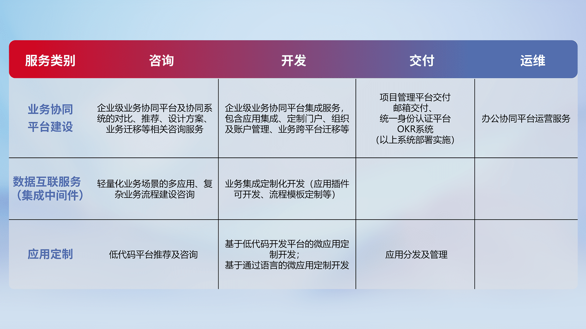 针对钉钉、、企微、、、、IDaas等平台级产品提供产品的规划、、、、方案、、交付、、定制化开发等服务,,实现如统一协同办公、、、智能客户服务、、混合会议管理、、、智能数据查询、、、、等业务场景,,,实现数字化转型。。。。