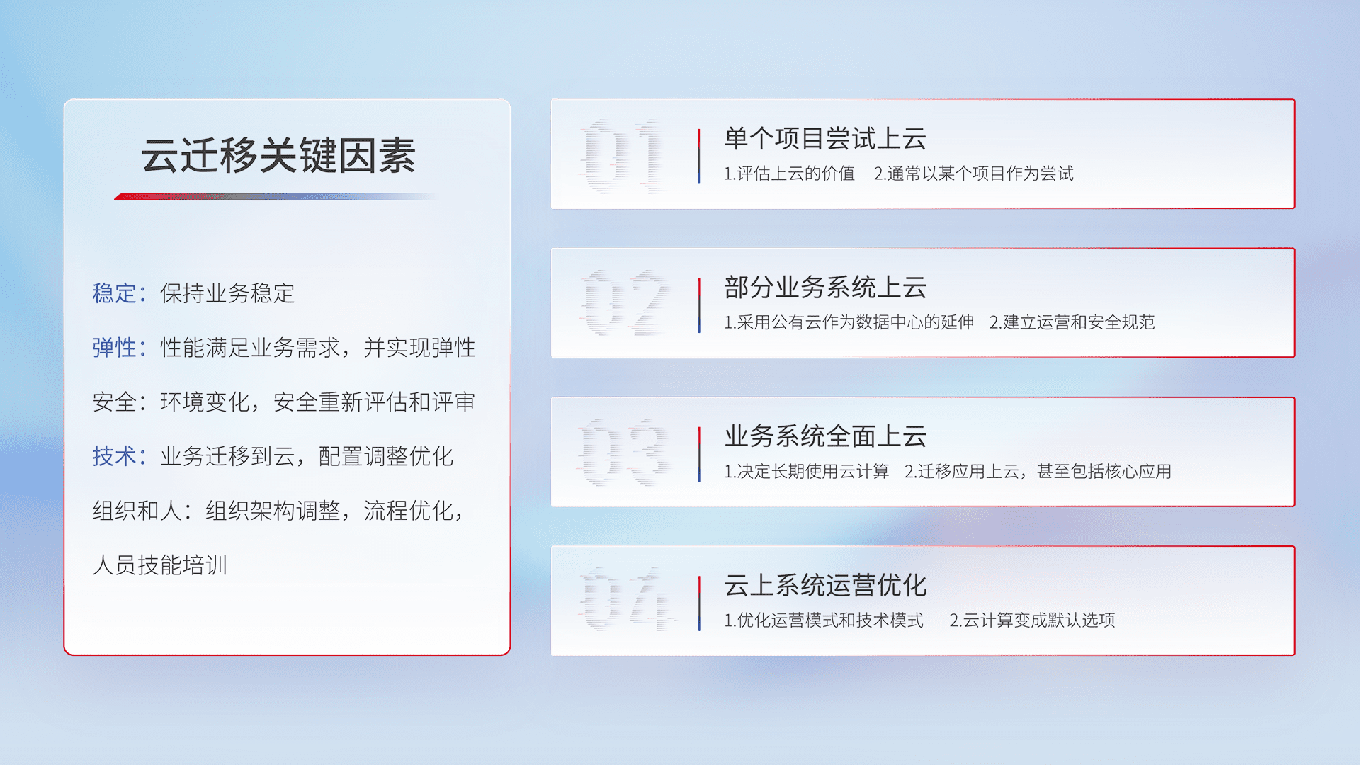 结合实际业务,,,从规划设计、、、、云平台选型、、、、云原生改造、、、、数据迁移、、、、集成交付,,,,迁移全过程为客户识别最佳上云路径,,,,做好风险识别管理,,,,设计网络架构、、身份权限、、安全审计合规、、、操作审计、、、日志审计、、监控告警策略、、、多站点容灾设计等,,,,对云上基础设施进行整体规划,,提升IT治理水平,,,以满足弹性、、、、高可用、、、高性能的需求。。。