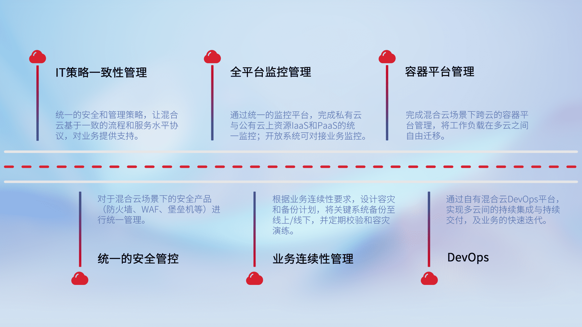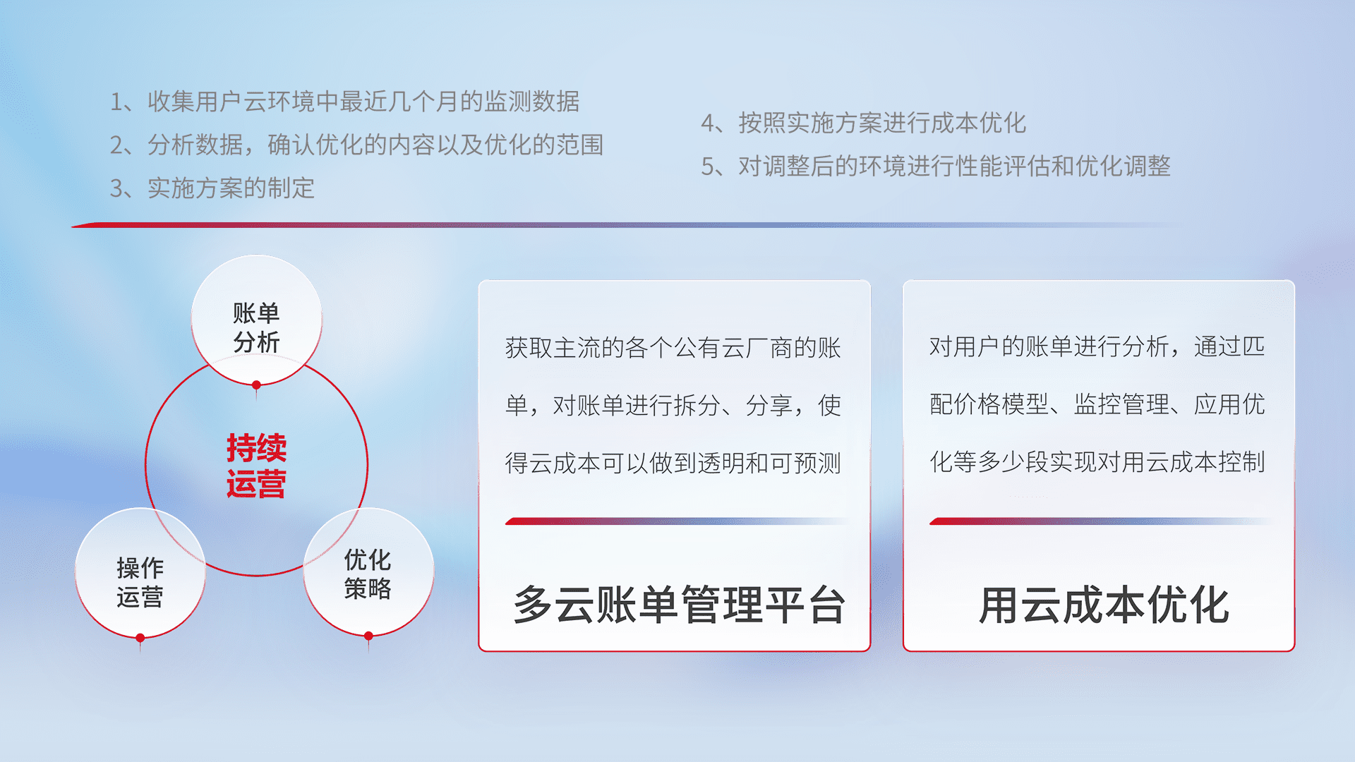 通过多云纳管,,以统一的资源数据模型把客户的云资源进行抽象和封装,,,进而实现对多云资源的统一操作,,保障云资源管理的可靠性、、、、稳定性与可用性。。量身定制化运维内容,,配置、、、、开发运维、、补丁管理、、、备份、、、、监控、、认证和访问管理、、审计和日常巡检等,,保障在用云过程中的可靠度,,,稳定度以及高可用率。。